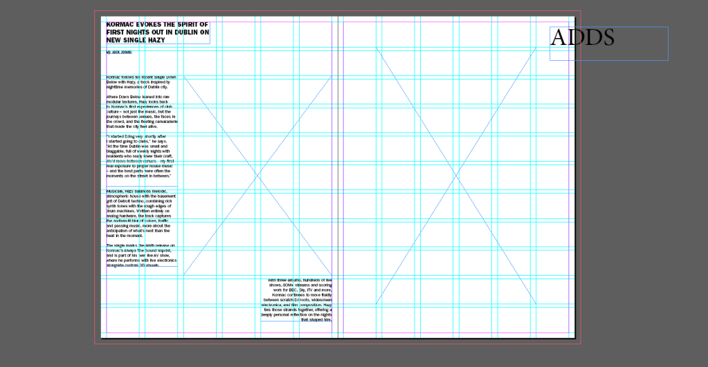Using the defined grid system and typography style sheet, I created a first rough draft of the article layout. This draft is a rough ”sketch” on testing text flow, hierarchy, and image placement. Want to create a pleasant white space, with great images, illustrations, commercial adds of events (just like in old magazines of i-D), but not overdoing it, but creating a comfortable view for a reader.
